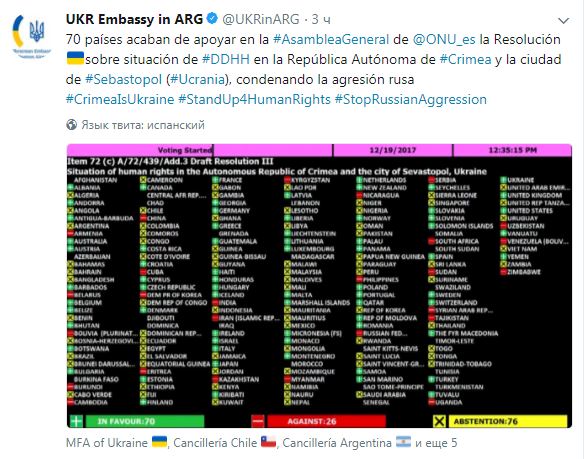Как сообщает посольство Украины в Аргентине в Twitter, 26 стран-членов Генассамблеи ООН проголосовали против обновленной резолюции по правам человека в оккупированном Крыму.