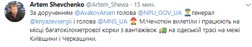 По словам Шевченко, по доручению Арсена Авакова глава Нацполиции Сергей Князевич и глава ГосЧС Николай Чечеткин вылетели и работают на месте затора на границе Черкасской и Киевской областей.