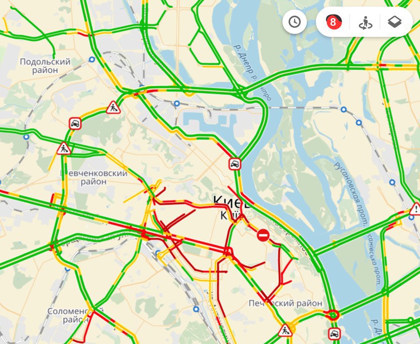 В Киеве по состоянию на 15.45 среды, 20 декабря пробки уже вышли из-под контроля  и составляют 8 баллов. Стоит или едет со скоростью 3-5 км\ч центре города -  улицы Крещатик, Ярославов вал, Прорезная, Богдана Хмельницкого, бульвар Тараса Шевченко.