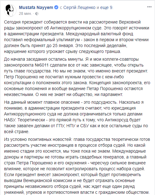Петр Порошенко собирается сегодня внести в Верховную Раду обещанный законопроект об Антикоррупционном суде. Об этом в Facebook сообщает нардеп Мустафа Найем со ссылкой на источники в Администрации президента.