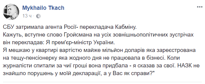 "Личный переводчик премьер-министра (!) воюющей (!!) страны оказался российским шпионом. Это не то, на чем СБУ должна пиариться. Это то, за что нужно немедленно отправлять в отставку - если не председателя СБУ, то начальника военной контрразведки как минимум".