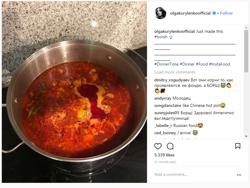 "Просто приготовила борщ", – подписала Ольга фото на английском.