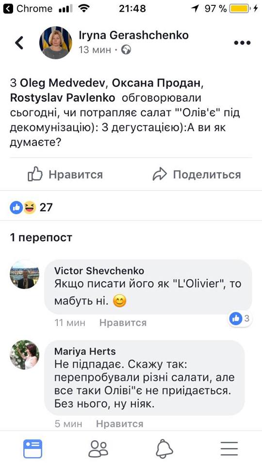 "С Олегом Медведевым, Оксаной Продан, Ростислав Павленко обсуждали сегодня, попадает салат "Оливье" под декоммунизации) С дегустацией): А вы как думаете?" - написала она в Facebook.
