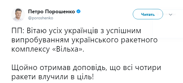 "Приветствую всех украинцев с успешным испытанием украинского ракетного комплекса "Ольха", - заявил Порошенко.