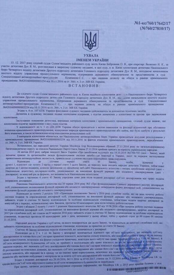 Поэтому обыск проводился у Дзюбенко, так как "по месту его жительства могут находиться принадлежащие Игорю Мосийчуку денежные средства, законность получения которых не подтверждена документами, или другие носители информации, которые содержат данные о движимом и недвтжимом имуществе И.Мосийчука, которое пребывает в его собственности и собственности его семьи, но передано другим лицам; по обслуживанию этого имущества, источников его приобретения и стоимости; лицах, которые прилекались к ремонтным работам и получали деньги за такие работы".