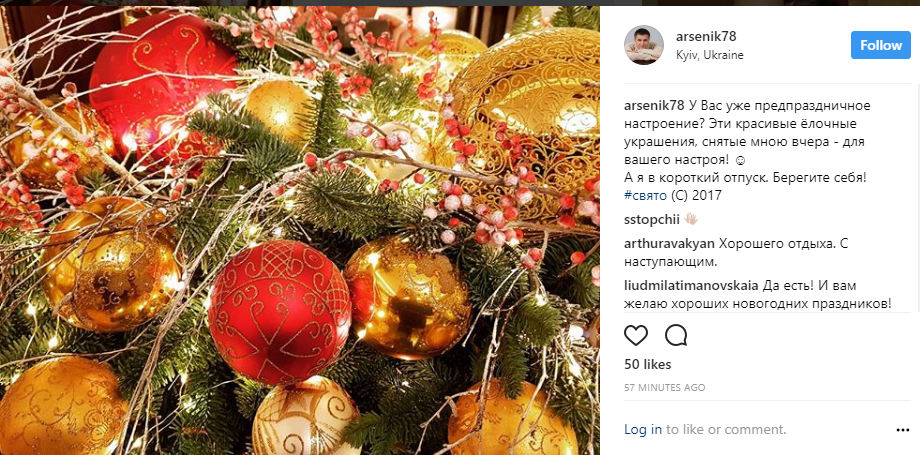 "У Вас уже предпраздничное настроение? Эти красивые ёлочные украшения, снятые мною вчера - для вашего настроя! А я в короткий отпуск. Берегите себя!"  - написал Аваков.
