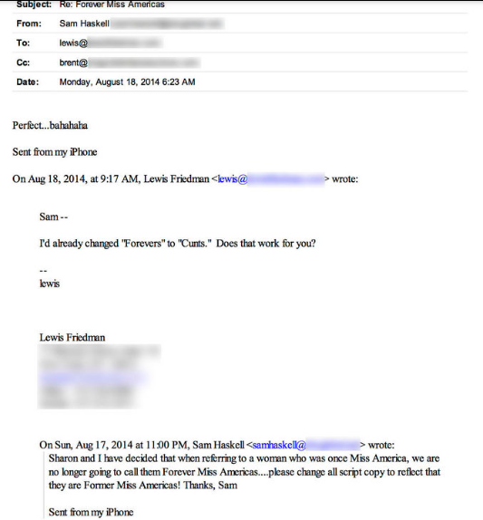В частности он предлагает изменить титул для бывших победительниц конкурса с "Forever Miss Americas" на "Former" (игра слов "вечная" и бывшая" - Прим.Ред.) На это собеседник отвечает, что уже изменил скрипт "Forever Miss Americas" на "cunts" (ругательство, обозначающее женский половой орган - Прим.Ред.).