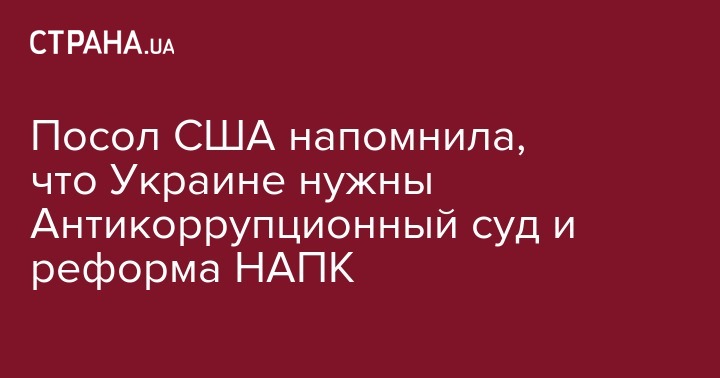 "Чтобы Украина достигла успеха, ее лидеры должны вновь подтвердить свою приверженность искоренению коррупции. Это означает создание Антикоррупционного суда с высоким стандартом честности на основе мнения Венецианской комиссии, предоставление НАБУ и САП инструментов и необходимой независимости для выполнения своих задач, реформирование НАПК, чтобы оно реализовывало свой мандат по предотвращению коррупции, а не давило на антикоррупционных реформаторов", - написала посол.