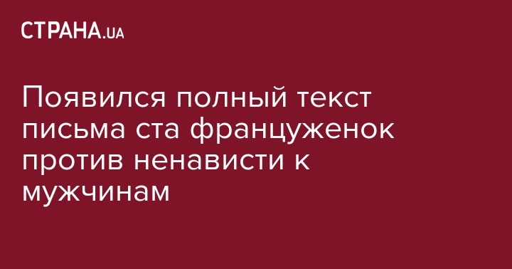 Опубликован полный текст нашумевшего письма против "ненависти к мужчинам", которое подписали 100 француженок, включая писательницу Катрин Милле, актрис Ингрид Кавен, Кэтрин Денёв и других. Письмо было опубликовано в номере газеты Le Monde за 9 января.