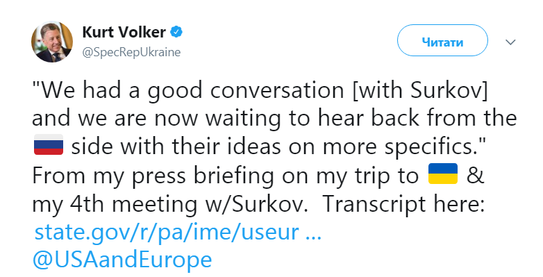 "У нас был хороший разговор с Сурковым, и мы теперь ждем, чтобы услышать со стороны (России) их идеи о более конкретных предложениях. Из моего пресс-брифинга о моей поездке в Украину и моего 4-го заседание с Сурковым", - указано в опубликованном сообщении.