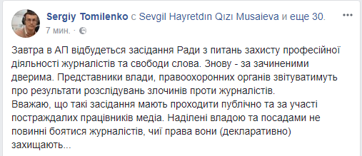 "Считаю, что такие заседания должны проходить публично и с участием пострадавших работников СМИ. Наделенные властью и должностями не должны бояться журналистов, чьи права они (декларативно) защищают ...", - написал Томиленко.
