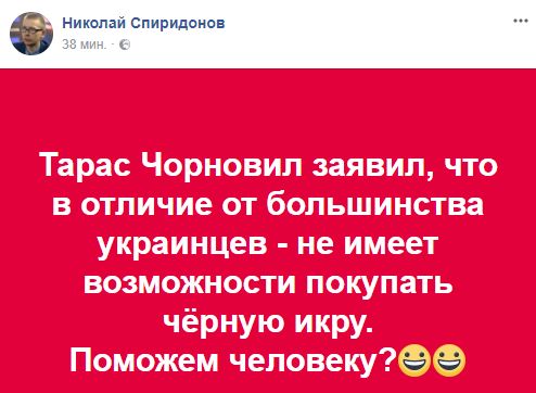 Политический консультант Николай Спиридонов шутит: "Тарас Чорновил заявил, что в отличие от большинства украинцев - не имеет возможности покупать черную икру. Поможем человеку?"