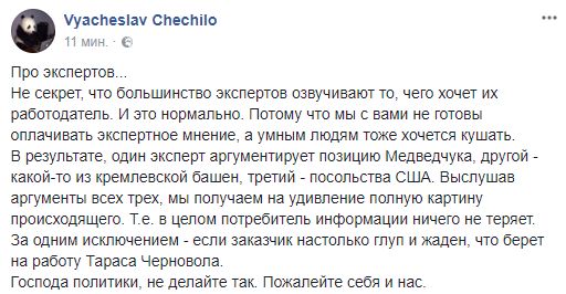 Журналист Вячеслав Чечило рассуждает о купленных экспертах: "Не секрет, что большинство экспертов озвучивают то, чего хочет их работодатель. И это нормально. Потому что мы с вами не готовы оплачивать экспертное мнение, а умным людям тоже хочется кушать.