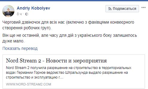 "Очередной звоночек для всех нас (включая специалистов конвейерного создания рабочих групп). Он еще не последний, но времени для действий с украинской стороны осталось очень мало", - сообщил он в среду на своей странице в Facebook.
