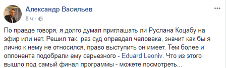 "По правде говоря, я долго думал приглашать ли Руслана Коцабу на эфир или нет. Решил так, раз суд оправдал человека, значит как бы я лично к нему не относился, право выступить он имеет. Тем более и оппонента подобрали ему серьезного - Эдуард Леонов". Что из этого вышло под самый финал программы - можете посмотреть...", - написал ведущий Александр Васильев.