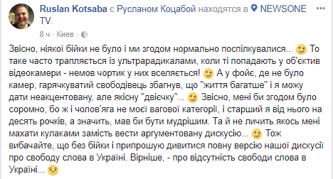 Позже Руслан Коцаба в Facebook сообщил, что драки не было.
