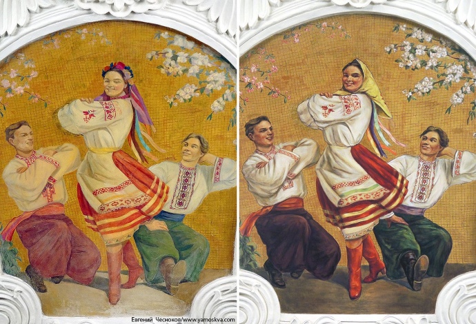 Как говорится в сообщении пресс-службы метро в ответ на вопрос блогера Рустема Адагамова в Twitter, фреске вернули оригинальный вид 1954 года, потому что тогда голову украинки на панно "Танцующие" покрывал платок.