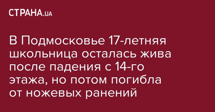В Подмосковье 17-летняя школьница осталась жива после падения с 14-го этажа, но потом погибла от ножевых ранений