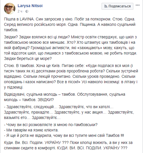 "Сын пригласил в кино. Побежал за попкорном. Стою. Одна. Посреди великого русского моря. Одна. Песчинка. А вокруг сплошной тамбов", – пишет Ницой, имея ввиду русскоязычных украинцев.