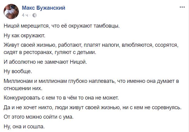 Блогер Макс Бужанский считает, что писательница просто пытается привлечь к себе внимание: "Ницой мерещится, что ее окружают тамбовцы. Ну как окружают. Живут своей жизнью, работают, платят налоги, влюбляются, ссорятся, сидят в ресторанах, гуляют с детьми. И абсолютно не замечают Ницой. Ну вообще.