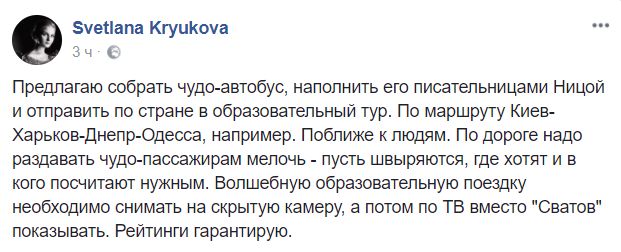 Так, журналист Светлана Крюкова пишет: "Предлагаю собрать чудо-автобус, наполнить его писательницами Ницой и отправить по стране в образовательный тур. По маршруту Киев-Харьков-Днепр-Одесса, например. Поближе к людям. По дороге надо раздавать чудо-пассажирам мелочь – пусть швыряются, где хотят и в кого посчитают нужным. Волшебную образовательную поездку необходимо снимать на скрытую камеру, а потом по ТВ вместо "Сватов" показывать. Рейтинги гарантирую".