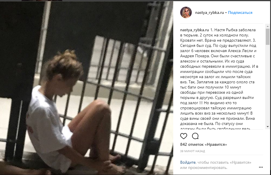 Настя Рыбка вторые сутки остается в тюрьме Таиланда и заболела из-за плохих условий содержания. Об этом сама девушка сообщает в Instagram.