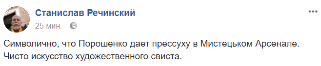 14:47  "Символично, что Порошенко дает прессуху в Мистецьком Арсенале. Чисто искусство художественного свиста", - иронизирует журналист Станислав Речинский.