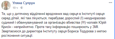 "То, что в детском отделении врожденных пороков сердца в Институте сердца среди детей, которые там лечатся, находится взрослый (!) Неоднократно судимый и обвиняемый за организацию убийства (!!!) человек Юрий Крысин - неприемлемо", - написала Супрун и призвала директора Института сердца Бориса Тодурова разъяснить ситуацию.