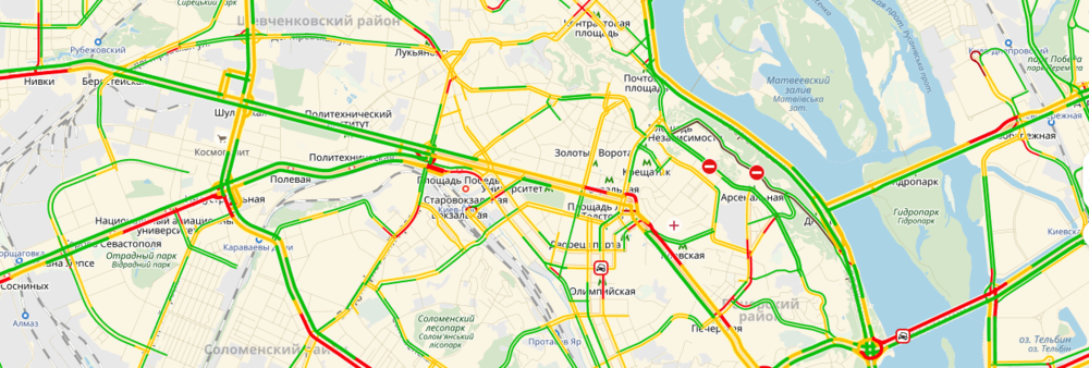 Заторы в районе метро Голосеевская по проспекту Голосеевский, возле Индустриального моста, Бессарабской площади.