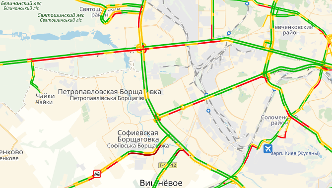 Небольшие заторы возникли на въезде со стороны Бучи, в районе Горенка. А также на проспекте Победы в сторону центра в районе метро "Житомирская" и в районе Софиевской Борщаговки.
