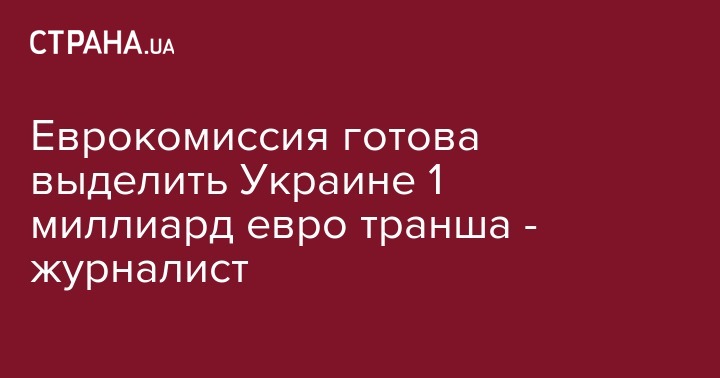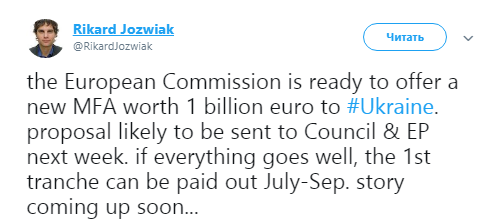 "Европейская комиссия готова предложить новый транш на сумму 1 млрд евро Украины. Предложение, вероятно, будет направлена в Совет Европы и Европейского парламента на следующей неделе. Если все будет хорошо, первый транш может быть выплачен в июле-сентябре", - написал журналист в Twitter.