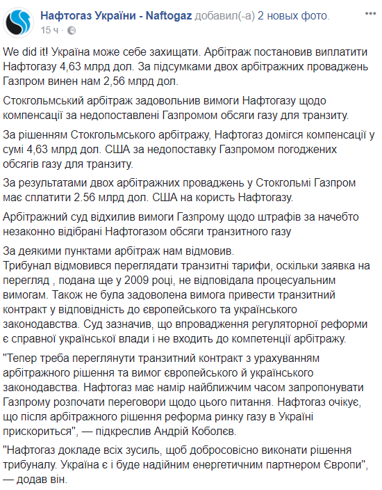 И посодействовали решению Стокгольмского арбитража, по которому Газпром должен НАКу более $2,5 млрд. И в итоге получается почти "по нулям".