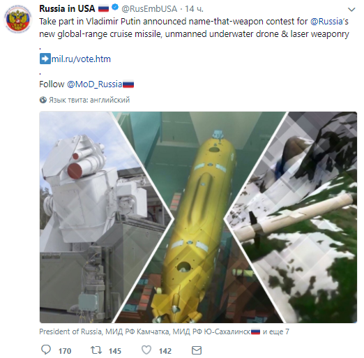 "Примите участие в объявленном Владимиром Путиным конкурсе "назови это оружие" для крылатой ракеты глобальной дальности, беспилотного подводного аппарата и лазерного оружия", - говорится в сообщении на странице посольства в Twitter.