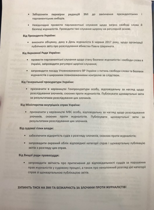 • выполнить обещание, данное в День журналиста 6 июня 2017 года, по организации публичного отчета о расследовании убийства Павла Шеремета.