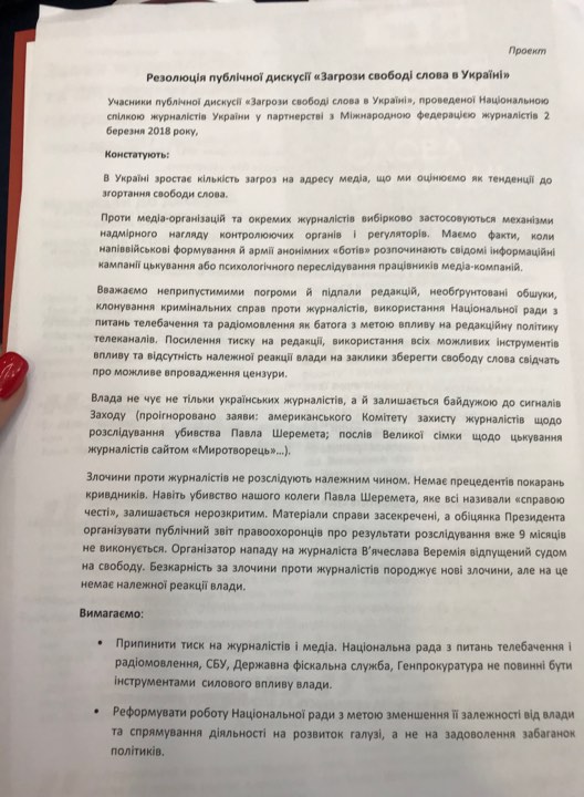 Участники публичной дискуссии «Угрозы свободе слова в Украине», проведенной Национальным союзом журналистов Украины в партнерстве с Международной федерацией журналистов 2 марта 2018 года, констатируют: