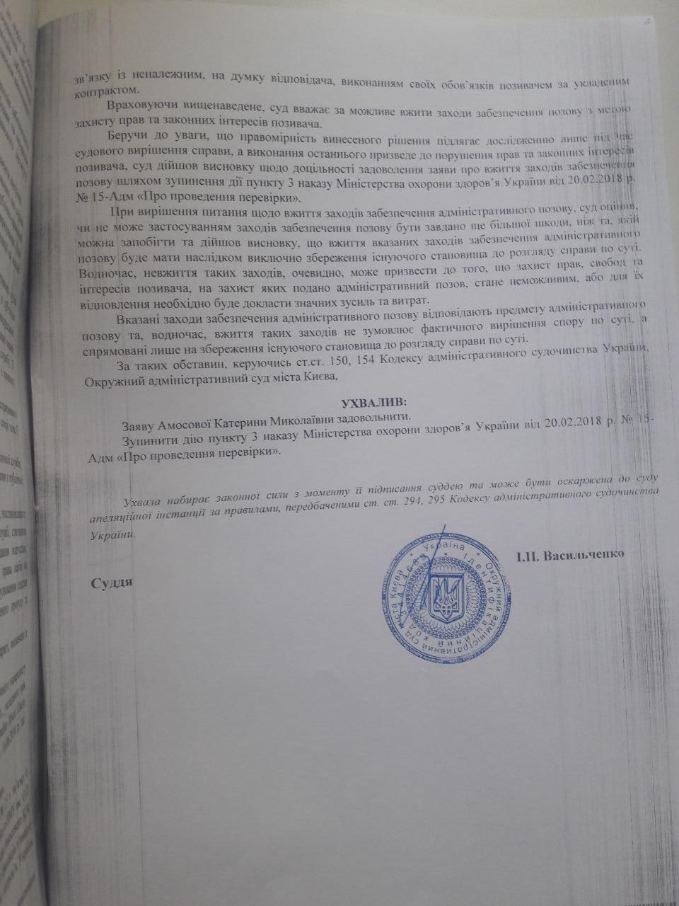 Изначально о незаконности приказа заявляла сама Амосова и ее адвокаты. На состоявшемся во вторник заседании Комитета охраны здоровья Верховной рады депутаты также усомнились в законности данного приказа, в связи с чем, обратились к премьер-министру Владимиру Гройсману с просьбой вмешаться в ситуацию и отменить незаконный приказ МОЗ.
