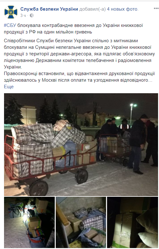 Сотрудники Службы безопасности Украины и таможенники блокировали в Сумской области нелегальный ввоз в Украину книжной продукции с территории России.