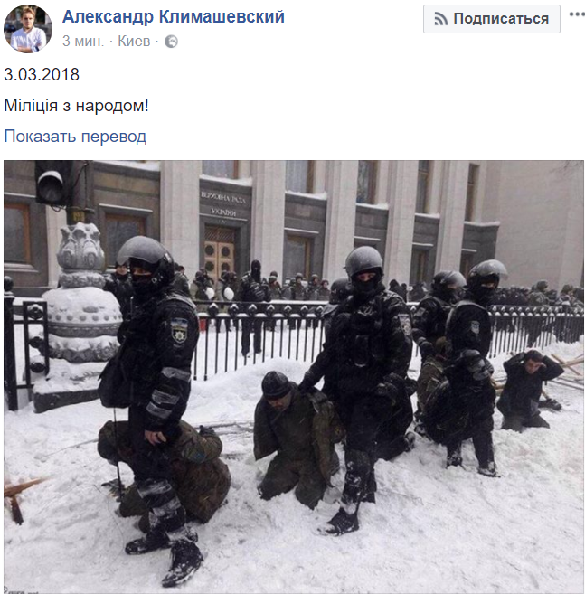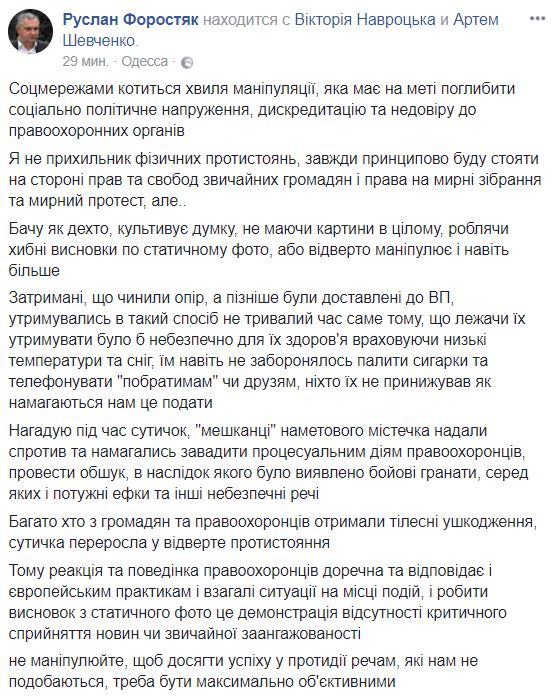 Как заявил советник начальника Главного управления Национальной полиции Украины в Одесской области Руслан Форостяк, задержанных активистов поставили на колени в ряд, чтобы не укладывать лицом в снег, иначе бы они простудились. Об этом Форостяк написал на своей странице в Facebook.