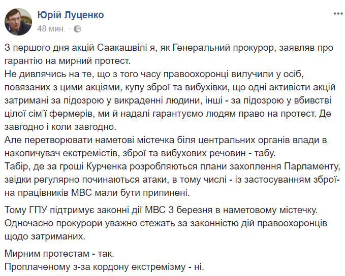12:30 Генпрокурор Юрий Луценко одобрил снос палаточного городка, назвав его "рассадником экстремизма" "за деньги Курченко".