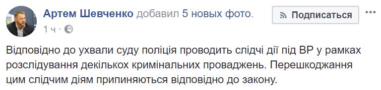 "В соответствии с постановлением суда, полиция проводит следственные действия в ВР в рамках расследования нескольких уголовных производств. Препятствования этим следственным действиям прекращаются в соответствии с законом", – пишет Шевченко.