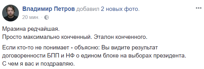 "Мы и наши сторонники давно переместились в регионы, где создаем центр общественного сопротивления. Вместе с другими общественными и политическими организациями. Что касается общественного протеста, то народ хочет вернуть себе Майдан, и сколько бы Порошенко его ни застраивал металлическими конструкциями, ни прикрывался погибшими героями или святой символикой государственного флага Украины, это ему не поможет. В Киеве есть много сакральных политических мест, где люди в любой момент могут проявить свой протест".