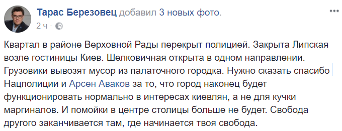 "Нужно сказать спасибо Нацполиции и Арсену Авакову за то, что город наконец будет функционировать нормально в интересах киевлян, а не для кучки маргиналов. И помойки в центре столицы больше не будет. Свобода другого заканчивается там, где начинается твоя свобода", – пишет политолог Тарас Березовец.