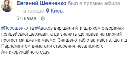 "Порошенко и Аваков решили идти по пути создания полицейского государства, а это значит, что права на мирный протест мы уже не имеем. Уничтожен лагерь активистов, которые под парламентом требовали создания независимого Антикоррупционного суда.