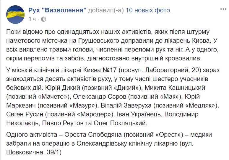 В городской клинической больнице Киева №17 (проул. Лабораторный, 20) сейчас находятся десять активистов движения, в том числе шестеро участников боевых действий Юрий Дикий (позывной "Дикий"), Никита Кашницкий (позывной "Мачете"), Александр Серов (позывной "Мак"), Юрий Маркевич (позывной "Мазур"), Виталий Заверуха (позывной "Медляк"), Евгений Русин (позывной "Мародер"), Иван Украинец Владимир Николаець, Павел Реутов и Олег Покляцкий. Одного активиста - Ореста Слободяна (позывной "Орест") - медики забрали на операцию в Александровскую клиническую больницу (ул. Шелковичная, 39/1).
