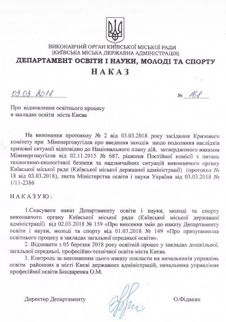 Департамент образования и науки, молодежи и спорта Киева уже выпустил соответствующий приказ о возобновлении обучения с 5 марта.