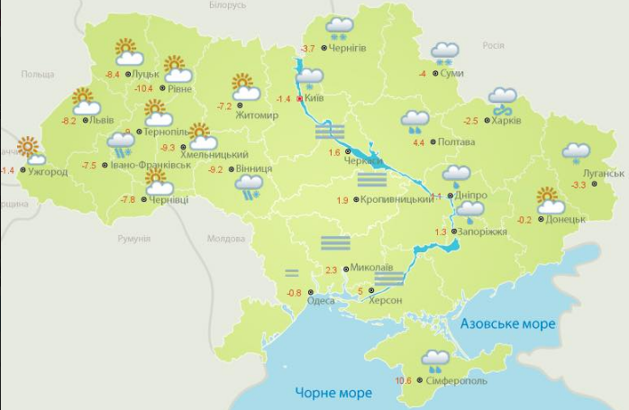 В воскресенье, 4 марта, в Украине местами еще ожидается мокрый снег и дождь. При этом завтра последний циклон покинет пределы Украины и снегопады прекратятся. Этой ночью ожидается -9...-15. Завтра днем до -4...-9.