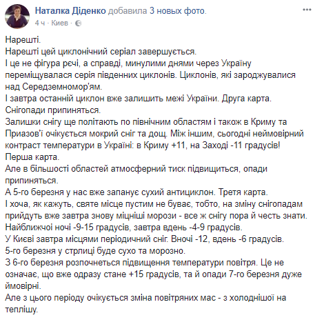 Синоптик Наталья Диденко дала прогноз погоды в Украине на ближайшие четыре дня, до 7 марта.
