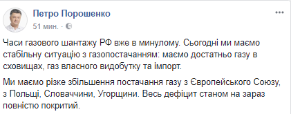 "Времена газового шантажа РФ уже в прошлом. Сегодня мы имеем стабильную ситуацию с газоснабжением: имеем достаточно газа в хранилищах, газ собственной добычи и импорт.