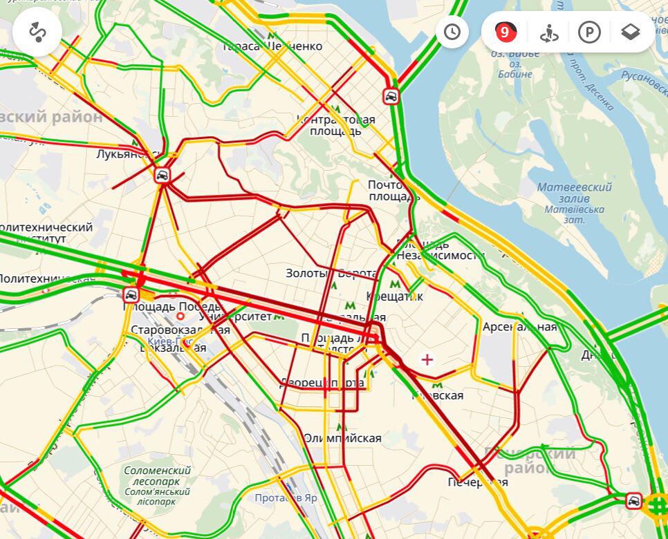 Движение затруднено у станций метро "Тараса Шевченко", "Контрактовая площадь", "Дружбы народов", "Лыбидская", "Дворец Украина", "Олимпийская", "Университет", "Театральная", "Золотые ворота", "Кловская", "Майдан Незалежности", "Крещатик".