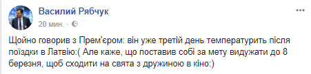 "Только что говорил с премьером: он уже третий день температурит после поездки в Латвию. Но говорит, что поставил себе цель выздороветь к 8 марта, чтобы сходить на праздники с женой в кино", - написал он.